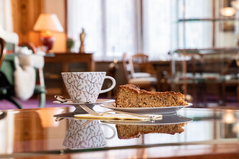 Zum Kaffeekränzchen am Nachmittag laden wir Sie herzlich in die Teestube ein. Neben einer kleinen, antiken Bibliothek bieten wir dort kostenlos hausgemachten Kuchen, zahlreiche Teesorten und Kaffee an - mit Blick auf die Berge, versteht sich.
